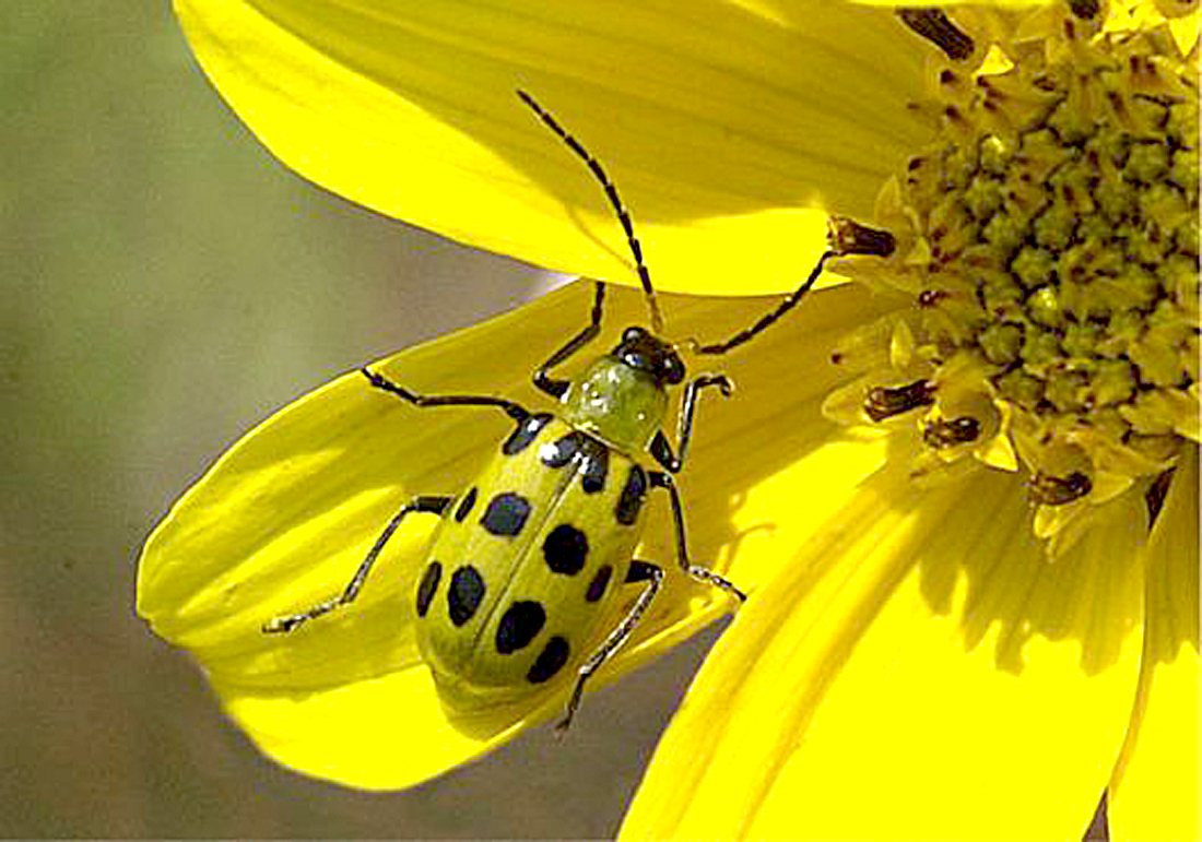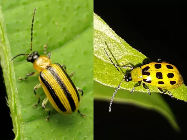 - Small beetles visible, often yellow-green with black stripes or spotted patterns