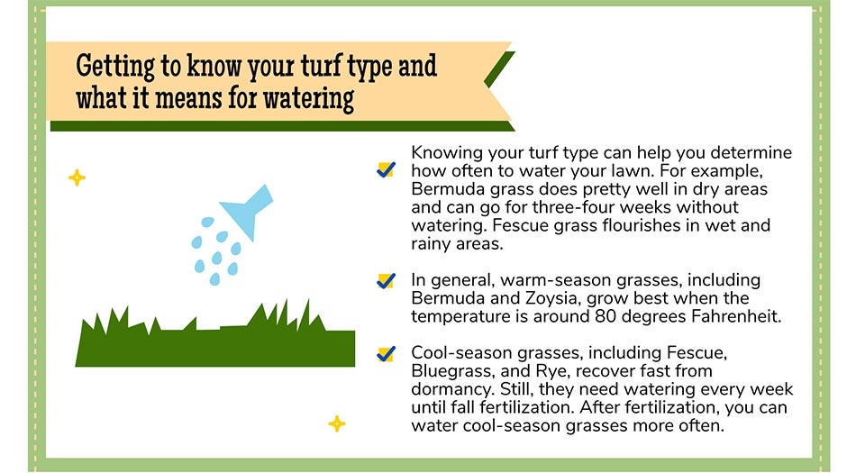 - Grass type: cool-season grasses need moderate watering; warm-season grasses need minimal